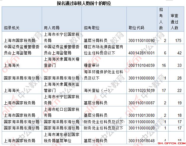 截止到31日10時(shí),競(jìng)爭(zhēng)比例的職位為上海市國(guó)家稅務(wù)局上海市長(zhǎng)寧區(qū)國(guó)家稅務(wù)局基層分局科員一職,招錄2人,截止到31日10時(shí)通過(guò)人數(shù)為175人。報(bào)名通過(guò)審核人數(shù)前十的職位主要集中在上海市國(guó)家稅務(wù)局,中國(guó)證券監(jiān)督管理委員會(huì)上海監(jiān)管局等部門,具體信息如下:二、 各職位報(bào)名人數(shù)分析