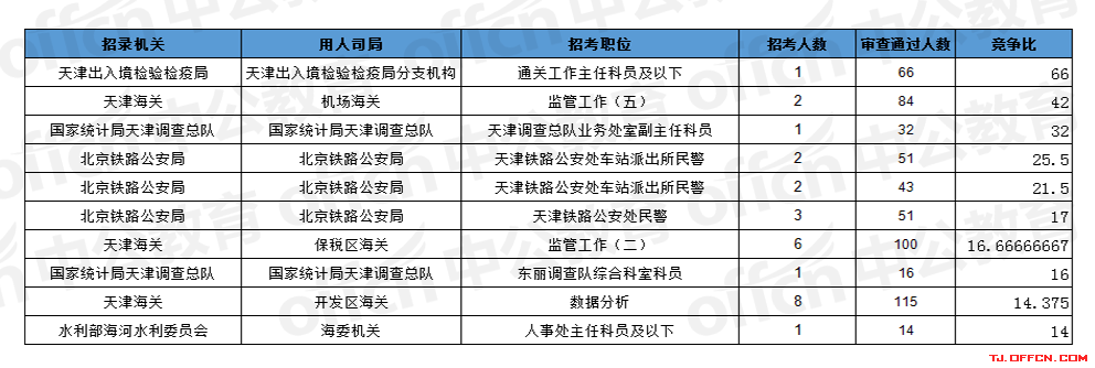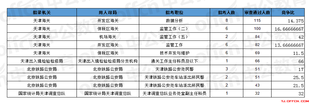 報名通過審核人數(shù)前十的職位主要集中在天津海關(guān)、北京鐵路公安局、天津出入境檢驗檢疫局等部門,具體信息如下: