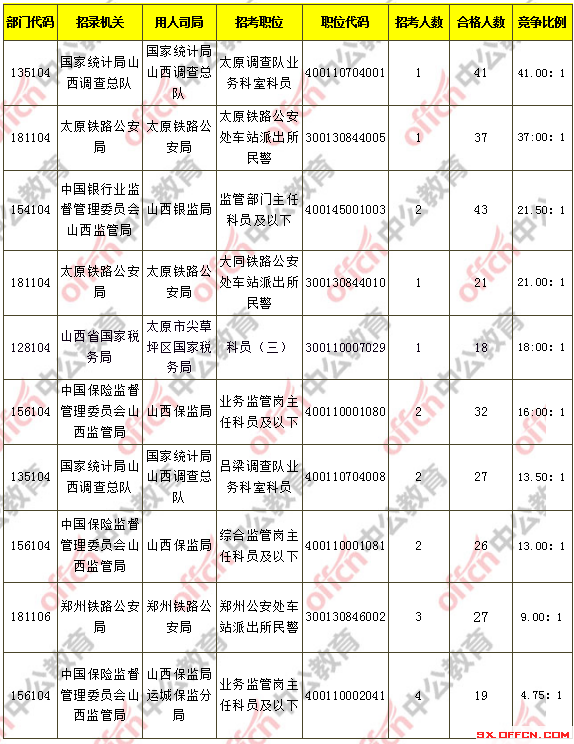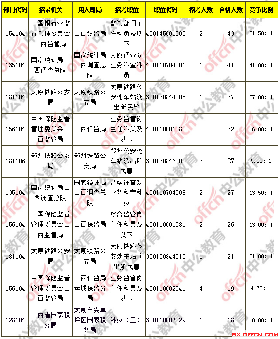 報(bào)名通過(guò)審核人數(shù)前十的職位主要集中在中國(guó)銀行業(yè)監(jiān)督管理委員會(huì)山西監(jiān)管局、國(guó)家統(tǒng)計(jì)局山西調(diào)查總隊(duì)、太原鐵路公安局等部門(mén),具體信息如下: