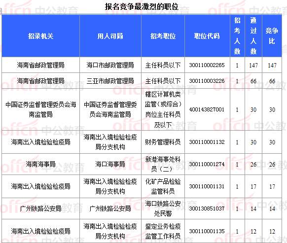 報(bào)名通過(guò)審核人數(shù)前十的職位主要集中在海南省郵政管理局、中國(guó)證券監(jiān)督管理委員會(huì)海南監(jiān)管局、海南出入境檢驗(yàn)檢疫局等部門(mén),具體信息如下: