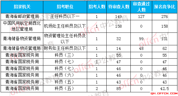 報名人數(shù)前十的職位主要集中在青海省郵政管理局、青海儲備物資管理局、青海省國家稅務局等部門,具體信息如下: