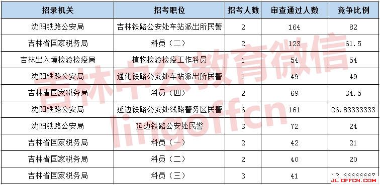 報(bào)名通過(guò)審核人數(shù)前十的職位主要集中在沈陽(yáng)鐵路公安局、吉林國(guó)家稅務(wù)局、吉林出入境檢疫檢驗(yàn)局等部門(mén),具體信息如下: