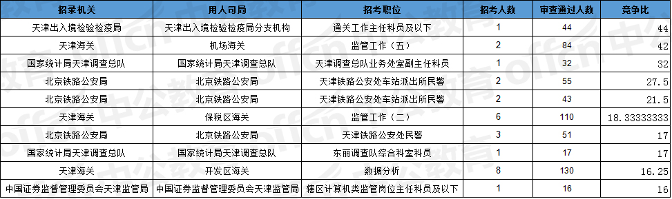 報名通過審核人數(shù)前十的職位主要集中在天津海關(guān)、北京鐵路公安局、天津出入境檢驗檢疫局等部門,具體信息如下: