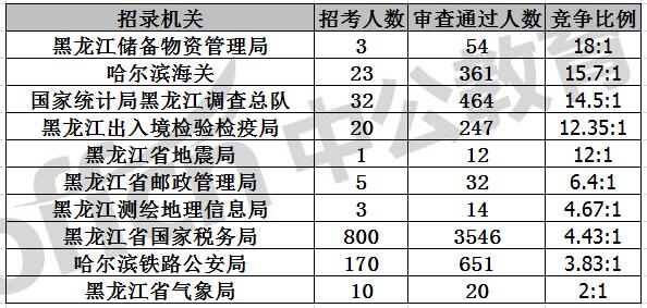截至11月1日16時,據(jù)中公網(wǎng)校統(tǒng)計,國考職位中工作地點在黑龍江的職位待審查3648人,審查通過5528人,與去年同期相比增加了1450。目前共有555個職位無人通過審核,與去年相比增加了377個職位,建議大家不要集中報考某個職位,85個職位無人報名,平均競爭比例為4.76:1。