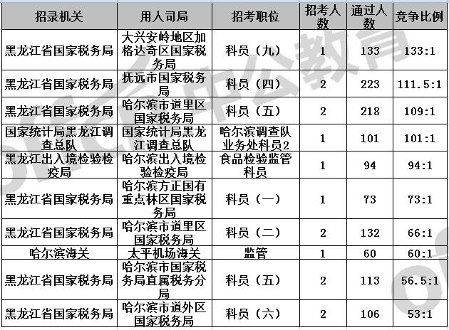 報(bào)名通過審核人數(shù)前十的職位主要集中在黑龍江省國家稅務(wù)局、國家統(tǒng)計(jì)局黑龍江調(diào)查總隊(duì)、黑龍江出入境檢驗(yàn)檢疫局等部門,具體信息如下: