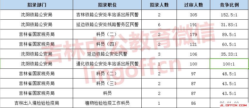 報名通過審核人數(shù)前十的職位主要集中在沈陽鐵路公安局、吉林國家稅務局、吉林出入境檢疫檢驗局等部門,具體信息如下: