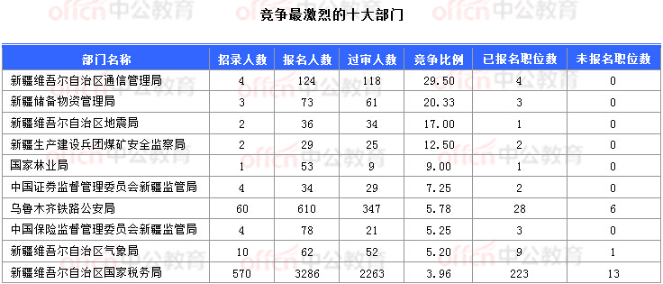 為幫助廣大考生更清晰的了解今日報名情況,中公網(wǎng)校整理了審核通過人數(shù)前十位的部門以及競爭比例最激烈的十大部門,供廣大考生參考: