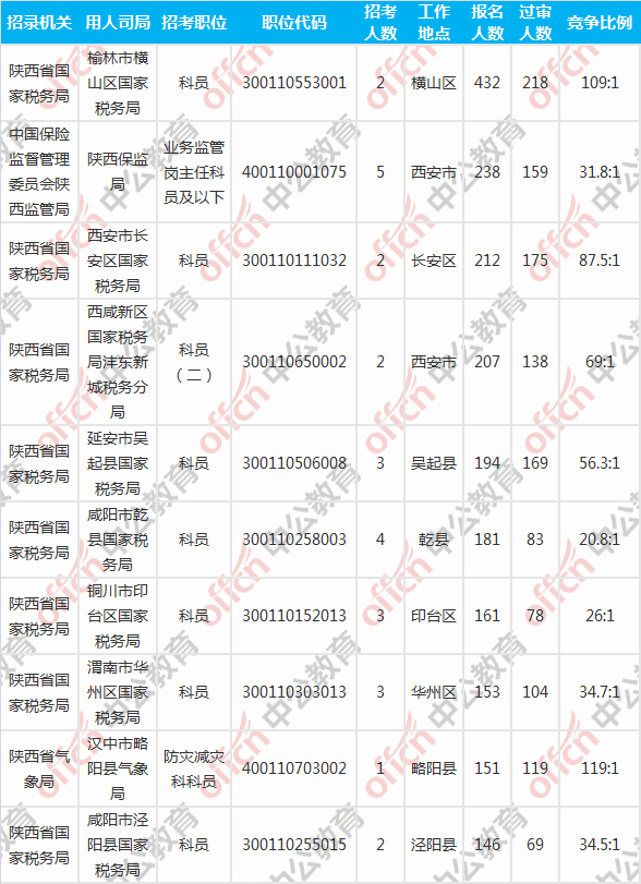 報(bào)名人數(shù)前十的職位主要集中在陜西省國家稅務(wù)局、中國保險(xiǎn)監(jiān)督管理委員會(huì)陜西監(jiān)管局、陜西省氣象局等部門,具體信息如下: