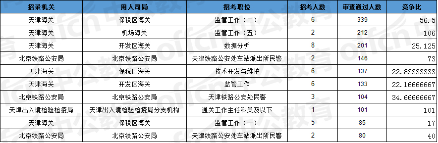 報名通過審核人數(shù)前十的職位主要集中在天津海關(guān)、北京鐵路公安局、天津出入境檢驗檢疫局等部門,具體信息如下: