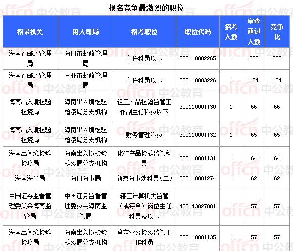 報名通過審核人數(shù)前十的職位主要集中在海南省郵政管理局、海南出入境檢驗檢疫局、海南海事局等部門,具體信息如下: