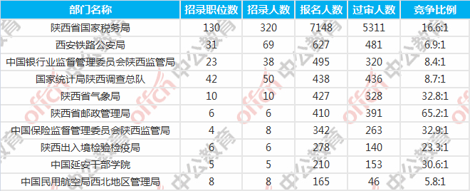 截至到3日9時,通過審核人數(shù)前三位的部門依次是:陜西省國家稅務(wù)局、西安鐵路公安局、中國銀行業(yè)監(jiān)督管理委員會陜西監(jiān)管局,三部門通過審核總?cè)藬?shù)達(dá)6112人,占通過審核總?cè)藬?shù)的75.1%。