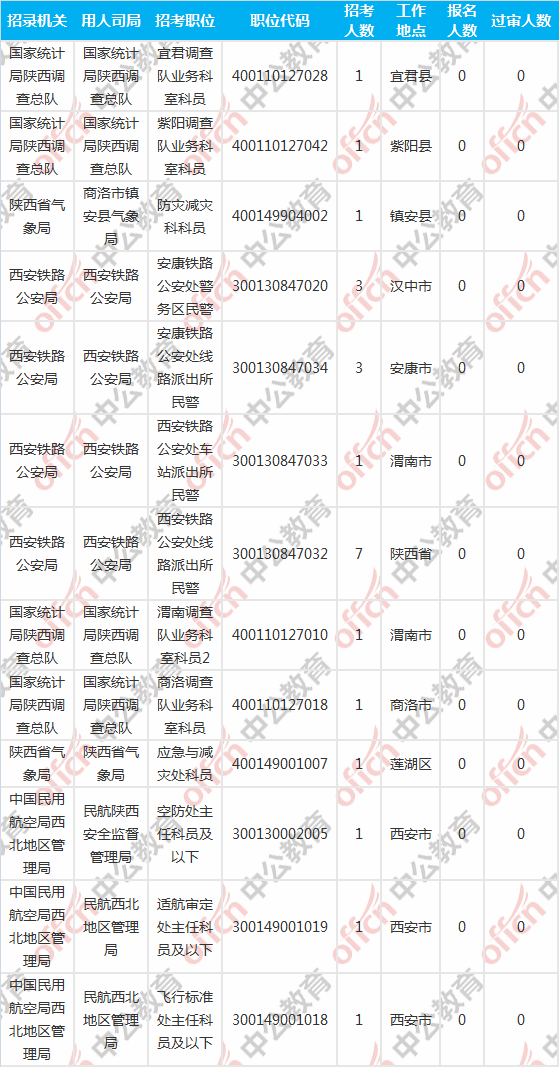 截至到3日9時(shí),工作地點(diǎn)在陜西的職位共有13個(gè)無人報(bào)考,占全部職位的4.52%。下面是無人報(bào)考職位一覽表,中公網(wǎng)校專家建議廣大考生多關(guān)注一些較冷職位,避免激烈競爭,結(jié)合自身?xiàng)l件,找到屬于自己的職位。
