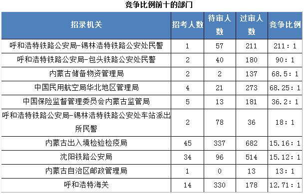 競爭比例的部門為呼和浩特鐵路公安局-錫林浩特鐵路公安處民警,招錄1人,截至到2017年11月2日16時(shí),過審人數(shù)為211人,其次是包頭鐵庫公安處民警,招錄2人,過審人數(shù)為180人。