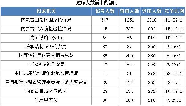 截止到2日16時(shí),通過審核人數(shù)前三位的部門依次是:內(nèi)蒙古自治區(qū)國家稅務(wù)局(過審6016人)、內(nèi)蒙古出入境檢驗(yàn)檢疫局(過審682人)、沈陽鐵路公安局(過審514人),三部門通過審核總?cè)藬?shù)達(dá)7212人,占通過審核總?cè)藬?shù)的70.3%。