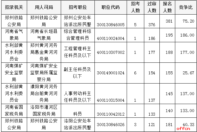 報名通過審核人數前十的職位主要集中在鄭州鐵路公安局、河南省氣象局、水利部黃河水利委員會等部門,具體信息如下: