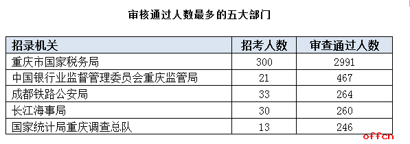 截止到3日16時(shí),通過審核人數(shù)前三位的部門依次是:重慶市國家稅務(wù)局、中國銀行業(yè)監(jiān)督管理委員會重慶監(jiān)管局、成都鐵路公安局,三部門通過審核總?cè)藬?shù)達(dá)3722人,占通過審核總?cè)藬?shù)的81%。