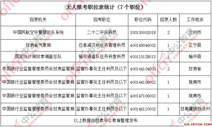 11月3日16時,工作地點在甘肅的職位共有11個無人待審,占全部職位的5.02%,7個職位無人報考,占全部職位的3.2%。下面是無人待審及無人報報職位一覽表,中公網(wǎng)校專家建議廣大考生多關(guān)注一些較冷職位,避免激烈競爭,結(jié)合自身條件,找到屬于自己的職位。