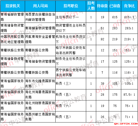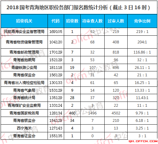 以下是3日16時(shí)各部門(mén)報(bào)名人數(shù)統(tǒng)計(jì)分析,其中中國(guó)民航青海安全監(jiān)督管理局、青海省物資儲(chǔ)備管理局、青海省郵政管理局等三個(gè)部門(mén)競(jìng)爭(zhēng)最激烈,競(jìng)爭(zhēng)比均超過(guò)116:1。