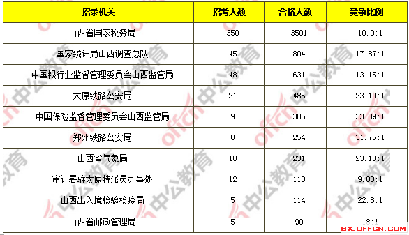 為幫助廣大考生更清晰的了解今日報名情況,山西中公網(wǎng)校整理了審核通過人數(shù)前十位的部門以及競爭比例最激烈的十大部門,供廣大考生參考:
