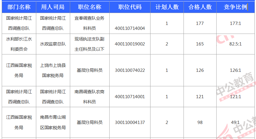 報(bào)名通過審核人數(shù)前十的職位主要集中在江西省國家稅務(wù)局、國家統(tǒng)計(jì)局江西調(diào)查總隊(duì)、水利部長江水利委員會(huì)等部門,具體信息如下: