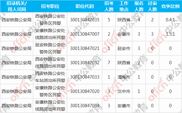 截至到3日16時(shí),陜西國考鐵路公安系統(tǒng)共有7個(gè)職位報(bào)考不足5人,占鐵路公安系統(tǒng)全部職位的22.6%。下面是陜西國考鐵路公安系統(tǒng)冷門職位一覽表,陜西中公網(wǎng)校專家建議廣大考生多關(guān)注一些較冷職位,避免激烈競(jìng)爭(zhēng),結(jié)合自身?xiàng)l件,找到屬于自己的職位。