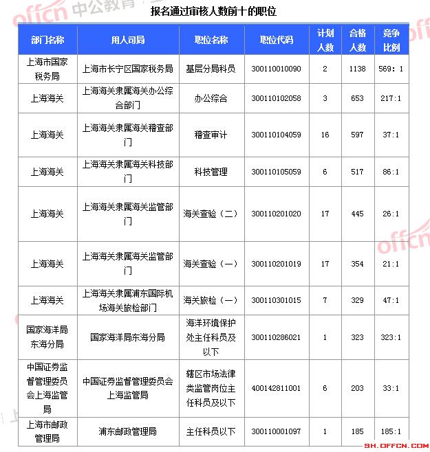 報名通過審核人數(shù)前十的職位主要集中在上海市國家稅務局、上海海關、國家海洋局東海分局等部門,具體信息如下: