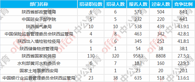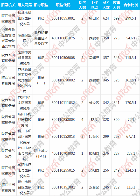 報(bào)名人數(shù)前十的職位主要集中在陜西省國家稅務(wù)局、中國保險(xiǎn)監(jiān)督管理委員會陜西監(jiān)管局、陜西省氣象局等部門,具體信息如下: