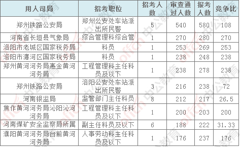 報名通過審核人數(shù)前十的職位主要集中在鄭州鐵路公安局、河南省氣象局、河南省國家稅務(wù)局,具體信息如下: