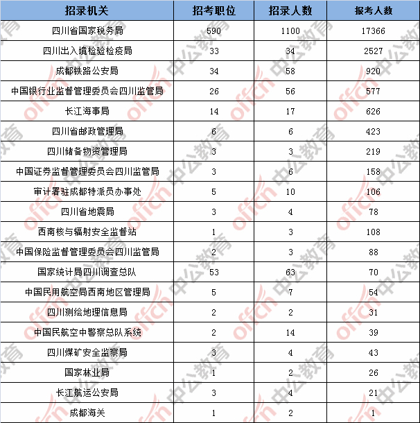 截至11月4日16時,據(jù)中公網(wǎng)校統(tǒng)計,2018國考招錄職位中工作地點在四川的職位通過審核總?cè)藬?shù)為23481人,共有21個職位暫無人報名,最熱職位競爭比例為502:1。