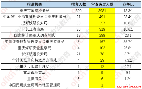 為幫助廣大考生更清晰的了解今日報名情況,重慶中公網(wǎng)校整理了重慶市招錄機(jī)關(guān)的招錄情況,供廣大考生參考: