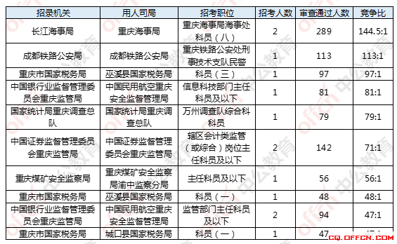 報名通過審核人數(shù)前十的職位主要集中在長江海事局、重慶市國家稅務(wù)局、中國證券監(jiān)督管理委員會重慶監(jiān)管局、成都鐵路公安局四個部門,具體信息如下:
