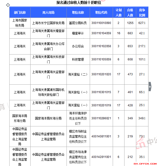 報名通過審核人數(shù)前十的職位主要集中在上海市國家稅務局、上海海關(guān)、國家海洋局東海分局等部門,具體信息如下: