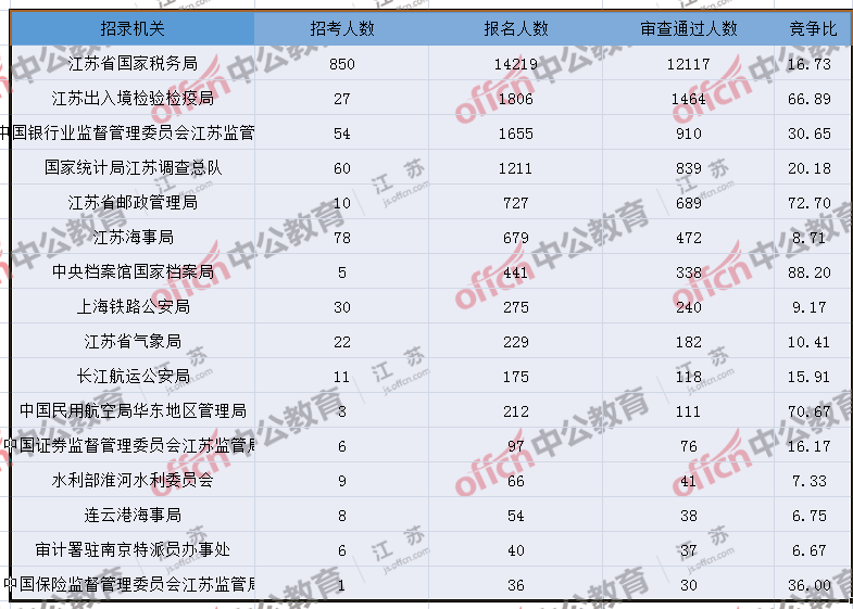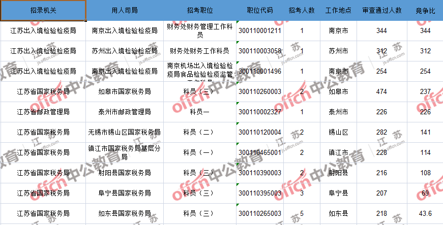 報名通過審核人數(shù)前十的職位主要集中在江蘇出入境檢驗檢疫局、江蘇省郵政管理局、江蘇省國家稅務(wù)局等部門,具體信息如下: