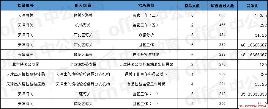 報(bào)名通過審核人數(shù)前十的職位主要集中在天津海關(guān)、北京鐵路公安局、天津出入境檢驗(yàn)檢疫局等部門,具體信息如下: