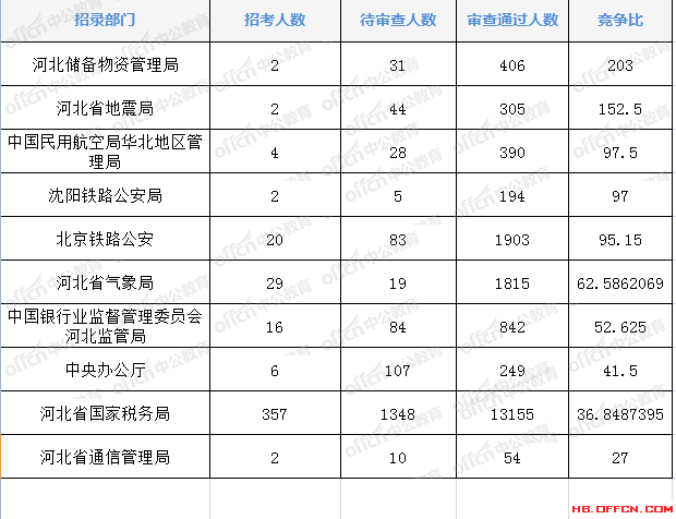 報(bào)名通過審核人數(shù)前十的職位主要集中在河北省氣象局、北京鐵路公安局、中國民用航空局華北地區(qū)管理局等部門,具體信息如下: