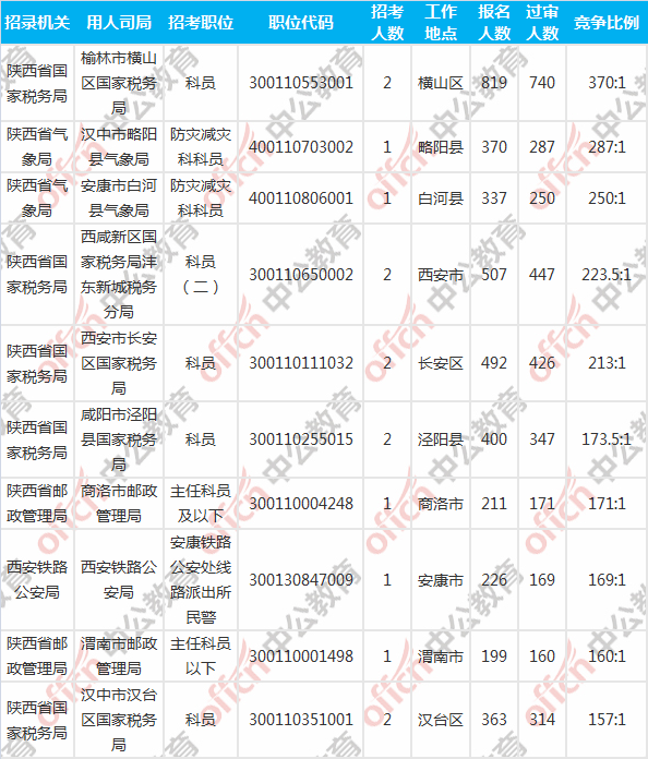 截至到6日9時,工作地點在陜西的職位僅有1個無人報考。下面是無人報考職位一覽表,中公網(wǎng)校專家建議廣大考生多關(guān)注一些較冷職位,避免激烈競爭,結(jié)合自身條件,找到屬于自己的職位。