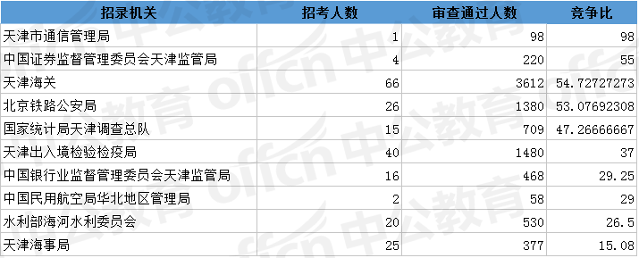 為幫助廣大考生更清晰的了解今日報名情況,中公網(wǎng)校整理了審核通過人數(shù)前十位的部門以及競爭比例最激烈的十大部門,供廣大考生參考: