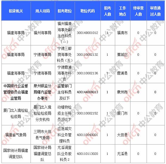 截止到7日9時(shí),工作地點(diǎn)在福建的職位共有7個(gè)無人報(bào)考,占全部職位的3.16%。下面是無人報(bào)考職位一覽表,中公網(wǎng)校專家建議廣大考生多關(guān)注一些較冷職位,避免激烈競爭,結(jié)合自身?xiàng)l件,找到屬于自己的職位。