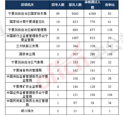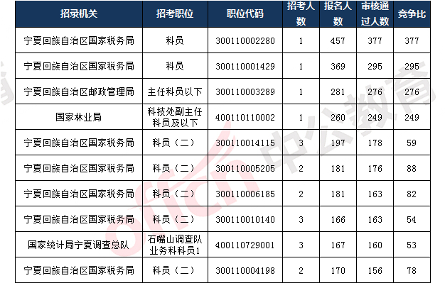 截止到11月7日16時(shí),報(bào)名通過(guò)審核人數(shù)前十的職位主要為寧夏回族自治區(qū)國(guó)家稅務(wù)局、寧夏回族自治區(qū)郵政管理局,具體信息如下: