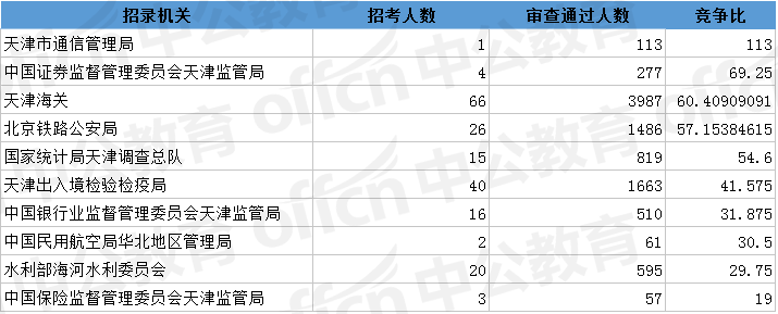 為幫助廣大考生更清晰的了解今日?qǐng)?bào)名情況,中公網(wǎng)校整理了審核通過(guò)人數(shù)前十位的部門(mén)以及競(jìng)爭(zhēng)比例最激烈的十大部門(mén),供廣大考生參考: