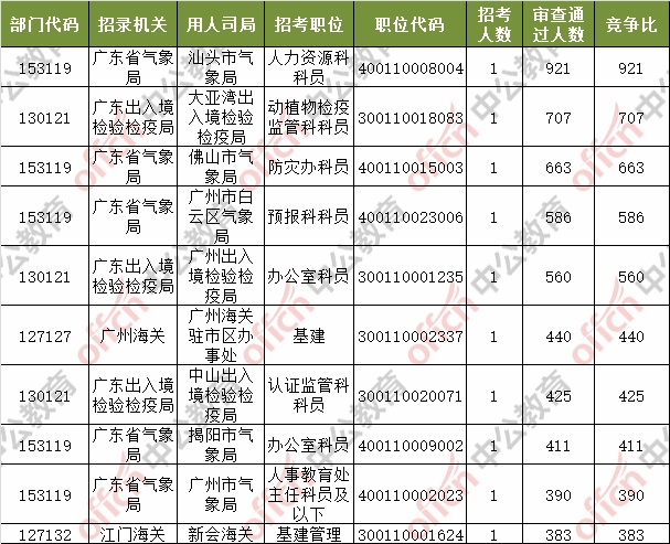 報(bào)名通過(guò)審核人數(shù)前十的職位主要集中在深圳海關(guān)、廣東省氣象局、珠海出入境檢驗(yàn)檢疫局等部門(mén),具體信息如下: