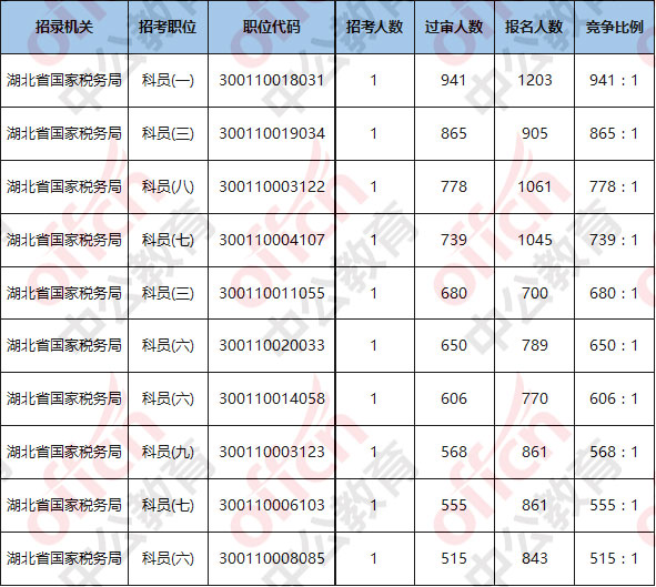 報名通過審核人數(shù)前十的職位主要集中在湖北省國家稅務(wù)局、武漢鐵路公安局等部門,具體信息如下: