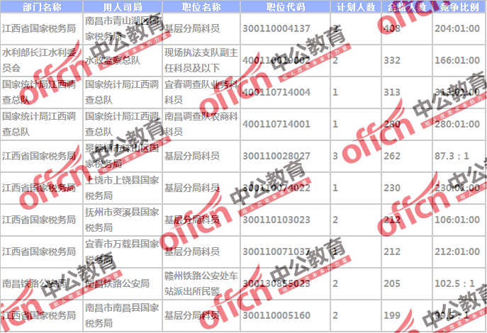 截止到7日16時(shí),競(jìng)爭(zhēng)比例的職位為江西省國(guó)家稅務(wù)局南昌市青山湖區(qū)國(guó)家稅務(wù)局基層分局科員一職,招錄2人,截止到7日16時(shí)通過(guò)人數(shù)為408人,位列第二的水利部長(zhǎng)江水利委員會(huì)水政監(jiān)察總隊(duì)現(xiàn)場(chǎng)執(zhí)法支隊(duì)副主任科員及以下一職,為166:1