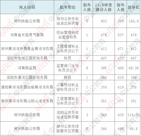 報(bào)名通過審核人數(shù)前十的職位主要集中在鄭州鐵路公安局、河南省氣象局、河南省國(guó)家稅務(wù)局,具體信息如下:
