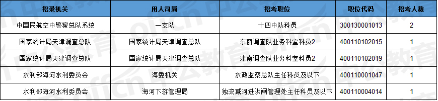 截止到8日09時(shí),工作地點(diǎn)在天津的職位共有5個(gè)無(wú)人報(bào)考,占全部職位的2.4%。下圖是無(wú)人報(bào)考職位一覽表,中公網(wǎng)校專家建議廣大考生多關(guān)注一些較冷職位,避免激烈競(jìng)爭(zhēng),結(jié)合自身?xiàng)l件,找到屬于自己的職位。
