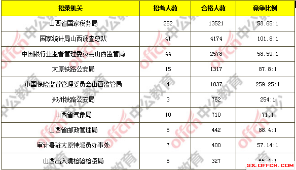 截至11月8日16時(shí),據(jù)中公網(wǎng)校統(tǒng)計(jì),國(guó)考職位中工作地點(diǎn)在山西的職位通過審核總?cè)藬?shù)為25795人,和昨天相比增加了6100人,與去年同期相比合格人數(shù)減少了2487人,截止目前共有5個(gè)職位無人報(bào)考,平均競(jìng)爭(zhēng)比例為48.58:1,和去年同期競(jìng)爭(zhēng)比增長(zhǎng)了5.79%。