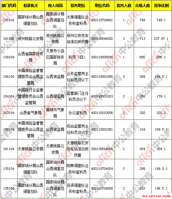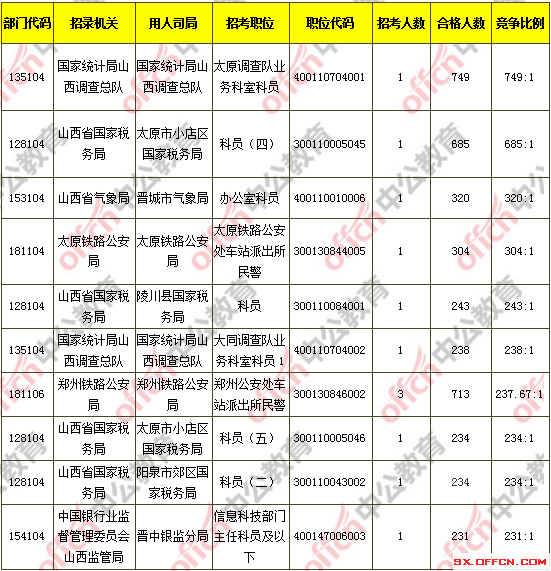 報名通過審核人數(shù)前十的職位主要集中在國家統(tǒng)計局山西調查總隊、鄭州鐵路公安局、山西省國家稅務局等部門,具體信息如下: