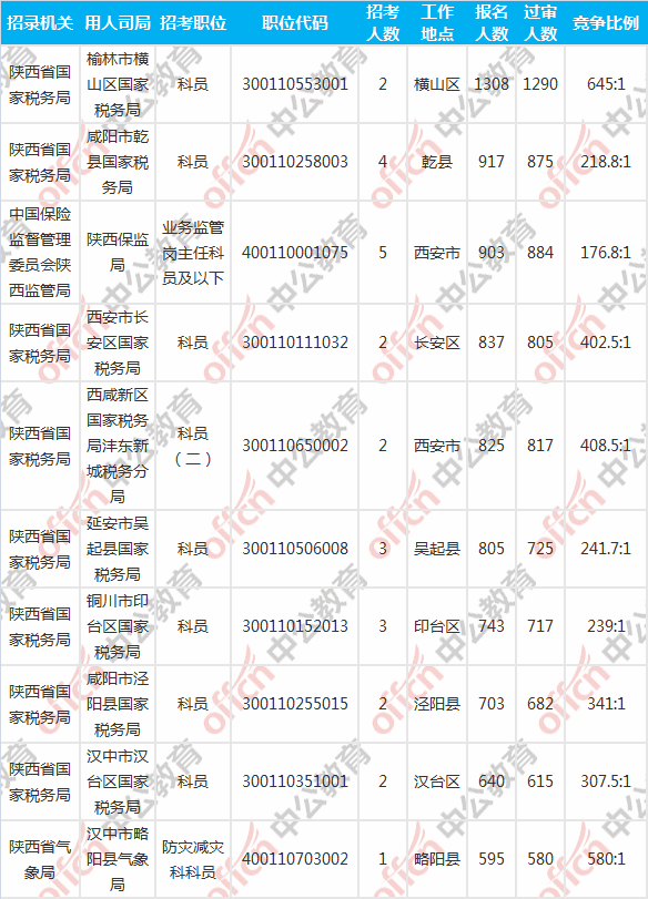 報(bào)名人數(shù)前十的職位主要集中在陜西省國(guó)家稅務(wù)局、中國(guó)保險(xiǎn)監(jiān)督管理委員會(huì)陜西監(jiān)管局、陜西省氣象局等部門(mén),具體信息如下: