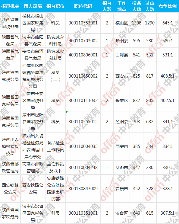 截至到8日16時,工作地點在陜西的,過審人數(shù)為0的職位共有1個。下面是過審人數(shù)為0 的報考職位一覽表,中公網(wǎng)校專家建議廣大考生再仔細看看職位表,千萬不要錯過了報名的時期。