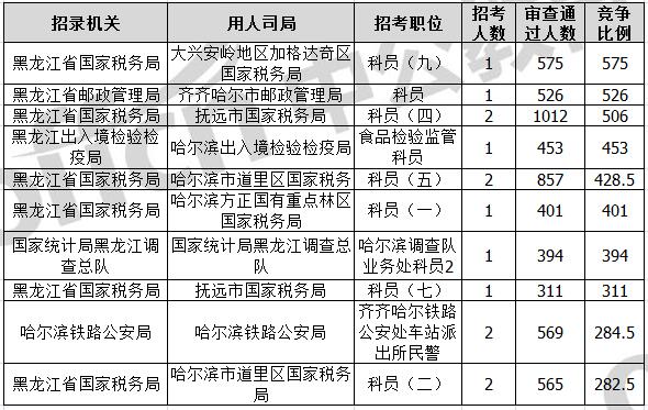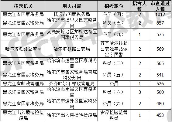 報(bào)名通過審核人數(shù)前十的職位主要集中在黑龍江省國家稅務(wù)局、哈爾濱鐵路公安局、黑龍江省郵政管理局等部門,具體信息如下: